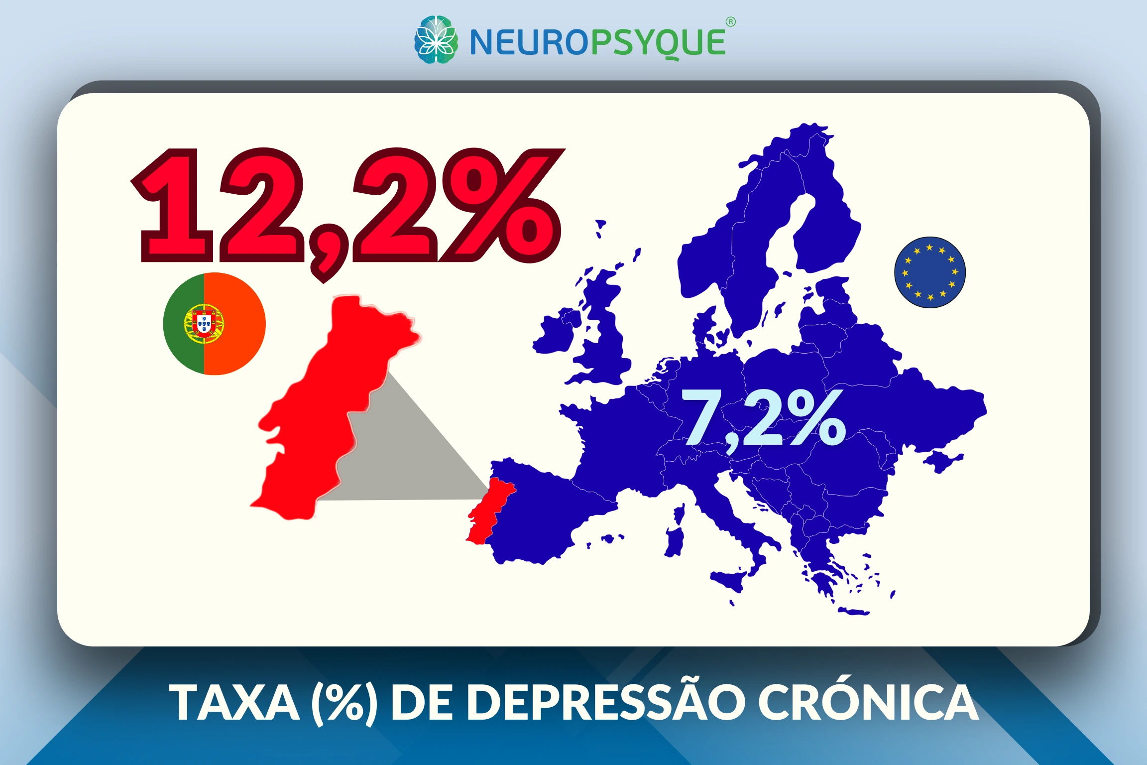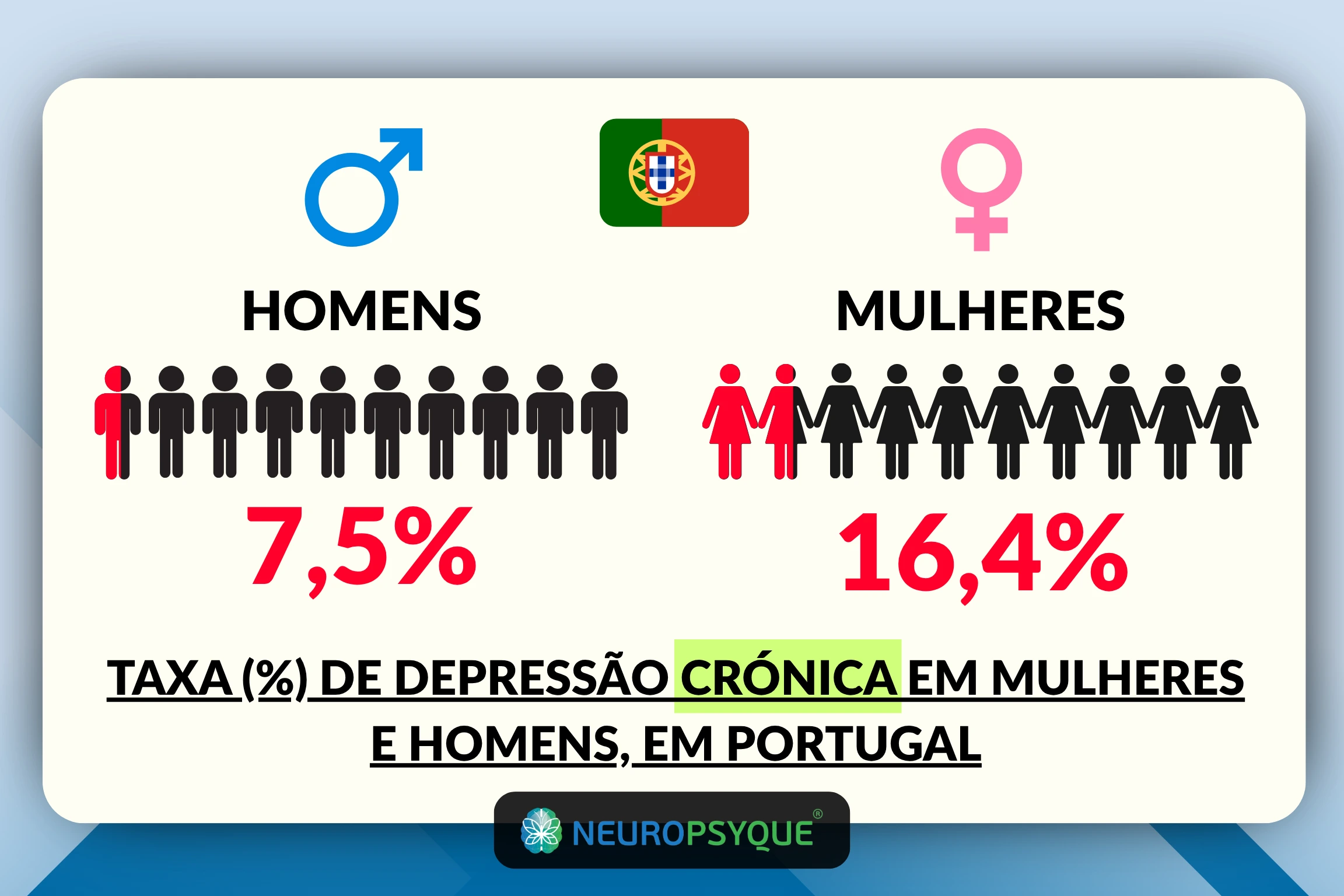 É uma das condições de saúde mental mais prevalentes em Portugal. Estima-se que cerca de 12% da população sofre de depressão crónica. Mais de 1 milhão de casos, fora todos os casos de depressão episódica, com números ainda superiores.