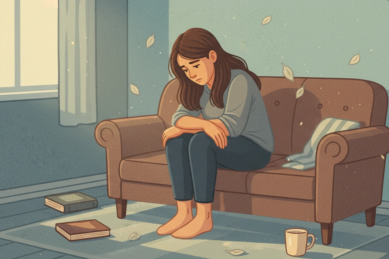Não é apenas tristeza – muitas pessoas descrevem como um vazio, uma ausência de sentir. Dias cinzentos mesmo quando o sol brilha.